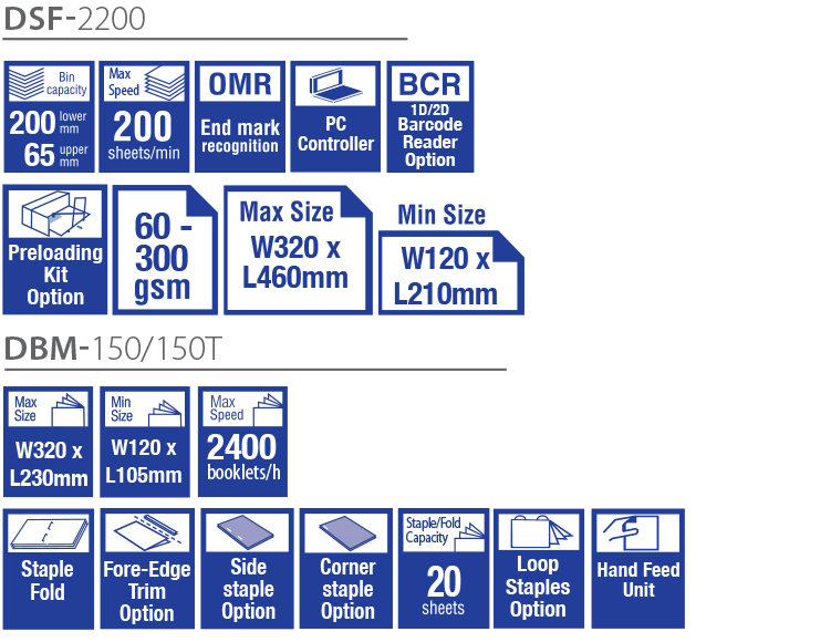 A rendszer akár 2400 irkát képes elkészíteni óránként, a kezelő beavatkozása nélkül, veszteségmentesen. Sőt, a DSF-2200 adagolótálcái ötféleképpen használhatók, a lehető legjobb hatásfok, teljesítmény érdekében.