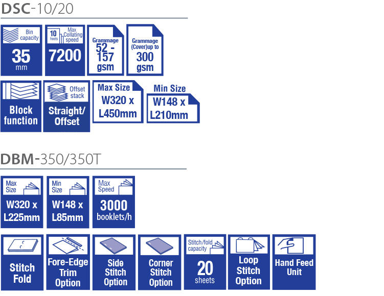 A 350C Füzetkészítő Rendszer a DSC-10/20 összehordó gépből és a DBM-350 füzetkészítő gépből áll. Ez a rendszer jó minőségű füzeteket készít az automata Deluxe tűzőfejekkel és a beépített gerincmegmunkálóval (spine press). A 350C Füzetkészítő Rendszerek magas termelőképességűek, 3000 darab A5 méretű könyvet képes elkészíteni óránként.