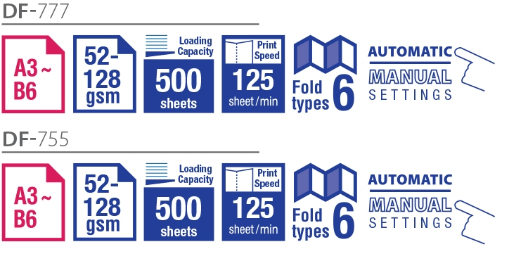 A DF-777 és a DF-755 helyigénye kicsi, így ideális megoldást jelentenek kis digitális nyomdáknak, grafikai stúdióknak. Különböző méretű papírokat képesek adagolni, A3-tól A5, valamint B4-től B6 méretig. Mindkét hajtogatógép papírtípusok széles választékát képes adagolni, jó minőségű felületkezelt, újrahasznosított és vékony papírokat. A DF-777 és a DF-755 hat előre programozott leggyakoribb hajtogatási módot tartalmaz, valamint egyszeri kereszthajtás és egyszeri levélhajtással van felszerelve, melyek nagy rugalmasságot biztosítanak.