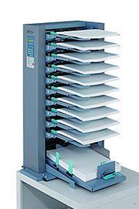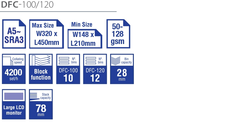 A DFC-100 egy olyan asztali görgős összehordó torony 10 adagolótálcával, melynek termelési sebessége eléri a 4200 szett/órát. A háromgörgős adagolórendszer sokféle anyagú papír megbízható adagolását biztosítja, beleértve bizonyos bevonatos tömböket is. Használható önálló egységként, vagy a Duplo füzetkészítővel összekötve is.
